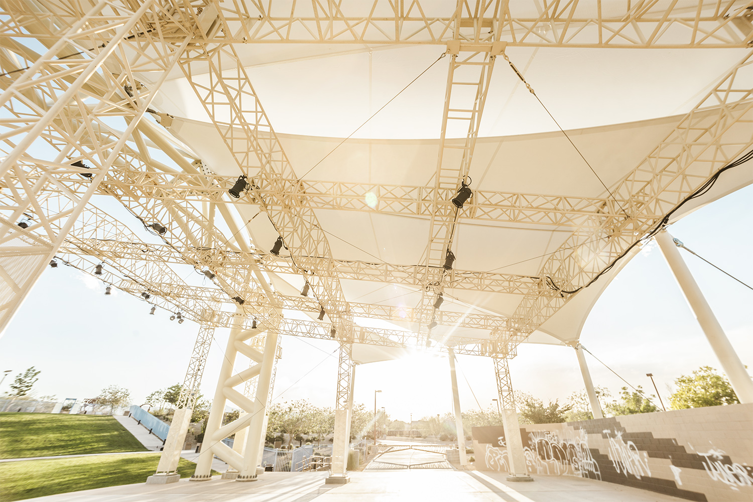 Sitting in a wide open area of Centennial Hills Park in Las Vegas, this natural amphitheatre dominates the landscape with its massive presence. Concerts, movie screenings, and entertainment events of all kinds are accommodated with the use of a custom grid from TOMCAT. From small to large-scale productions, this installation can handle it all. Inspired by Rome and brought to you by TOMCAT.