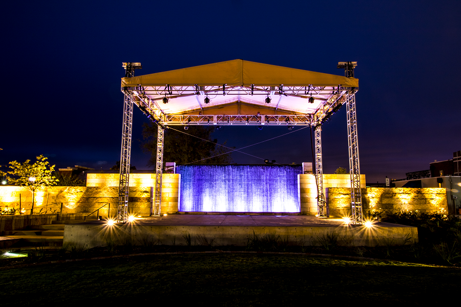 The City of Lewisville has a 33’x20’ semi-permanent roof (March – October) installed at the Medical Center of Lewisville Grand Theater at Wayne Ferguson Plaza. The roof consists of Medium Duty truss with a rafter system on 12” Light Duty towers.