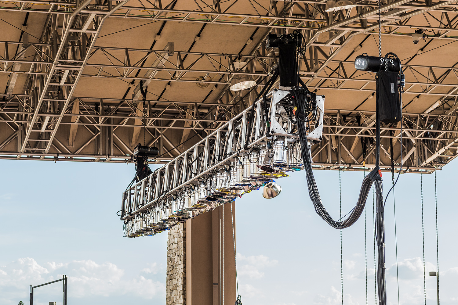 The Sandia Hotel and Casino is located in the dry, unrelenting desert heat of Albuquerque and features a unique amphitheater with a massive TOMCAT-designed truss grid structure. The majestic Sandia mountain range serves as an impressive backdrop for this premier Albuquerque outdoor venue, which lays more than 5,000 feet above sea level and hosts a wide variety of top shelf musical acts. The immense 60’ x 52’ truss grid was designed to optimize sightlines and is supported by four towers which mimic the hotel’s distinct architecture. These towers provide lateral stability to the grid using a discreet guide system on the front face of each tower. Additionally, each tower contains a hidden tandem hoist system for raising and lowering the truss grid. The front towers are set back to create a downstage cantilever on the front of the grid (20’) which lends an open feeling to the stage area, while providing excellent viewing angles from each of the 4,000 seats.